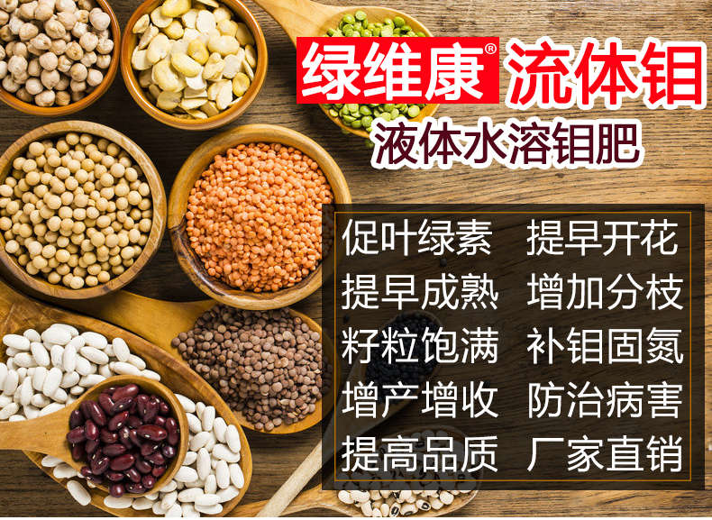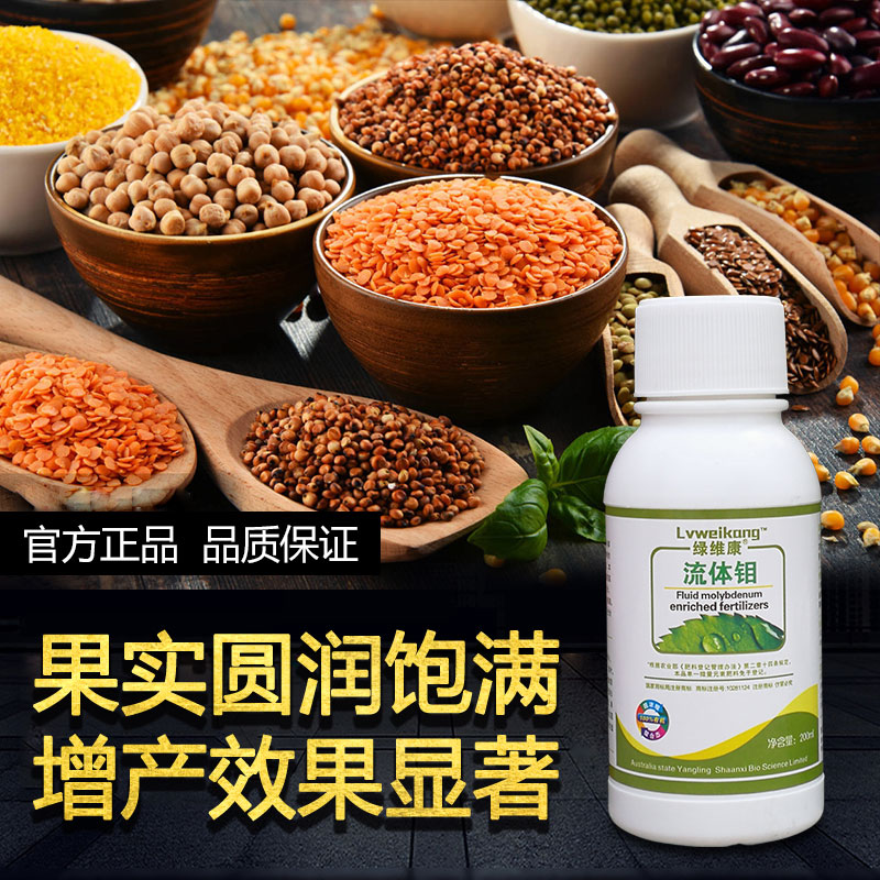 本品可有效防治因缺鉬而引起的植株矮小、葉片失綠、卷曲、枯萎、根瘤發(fā)育不良、黃葉、小葉、死苗、空粒、秕粒等癥狀。促進(jìn)生物固氮,顯著提高根瘤菌的固氮能力,有利于蛋白質(zhì)的合成,可使豆科植物的株高、分枝數(shù)、單株莢數(shù)、單莢粒數(shù)和種子千粒重增加,果實(shí)圓潤(rùn)飽滿,其增產(chǎn)效果顯著。